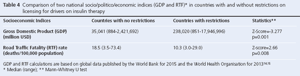 Restrictions on licences in drivers on insulin (in general) were examined according to two relevant national social/political/economic indices (GDP and RTF) (Table 4). GDP was significantly lower in 56 countries with no restrictions than in 25 countries with restrictions (p=0.001). The road traffic fatality rate per 100,000 population was greater in the 56 countries with no restrictions than in the 23 countries with restrictions (p=0.008).