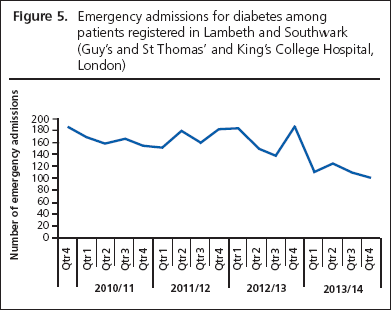 Has this service redesign been a success? The last four years have seen a steady reduction in referrals to hospital diabetes clinics (Figure 4), with a shift to the new community service, and also a reduction in local admissions due to diabetes (Figure 5). There has also been a sustained improvement in diabetes outcomes, with Lambeth moving from 26th to amongst the best for HbA1c control among Clinical Commissioning Groups in London. There has been improved detection of diabetes in the Borough with a narrowing of the actual to expected prevalence gap and just under 3,000 more people diagnosed with type 2 diabetes.
